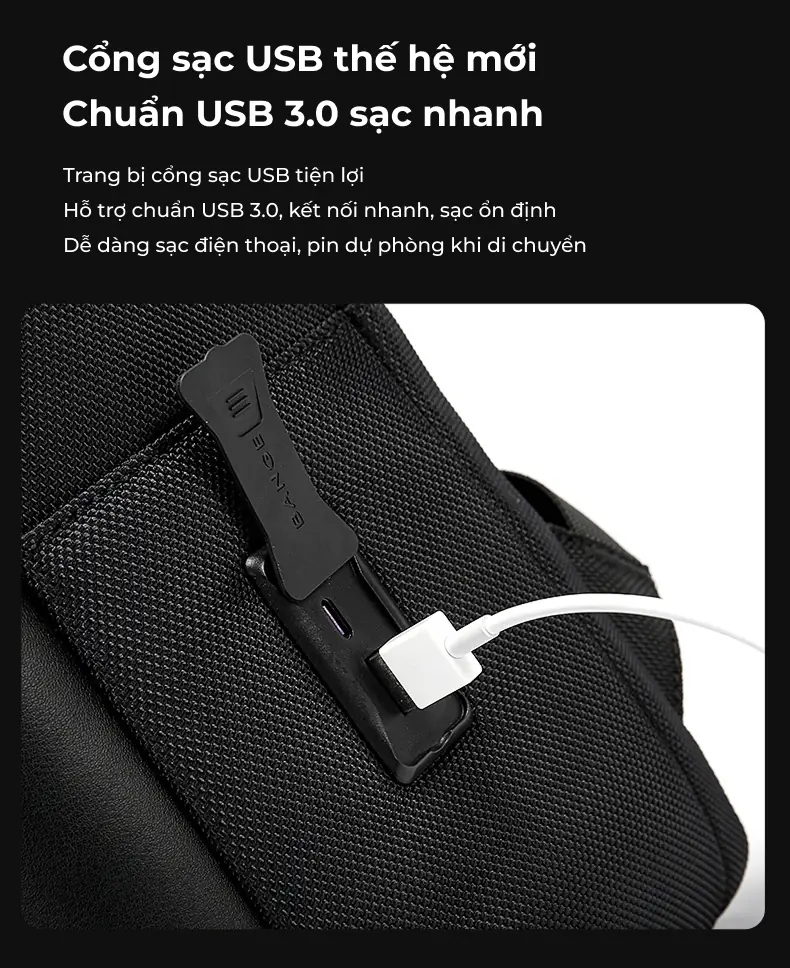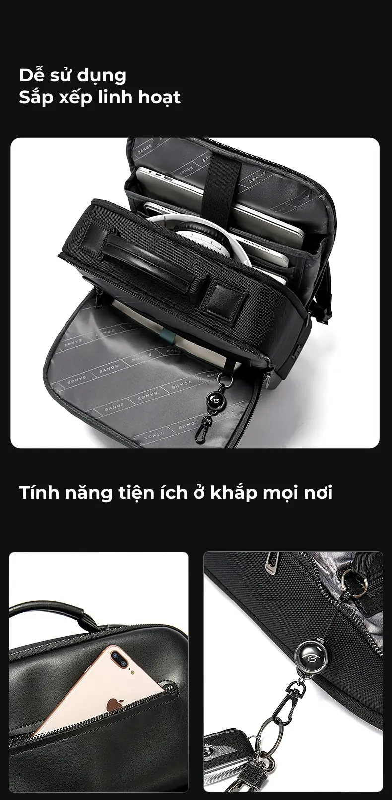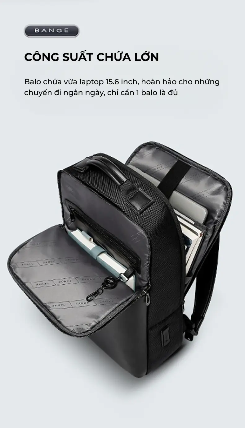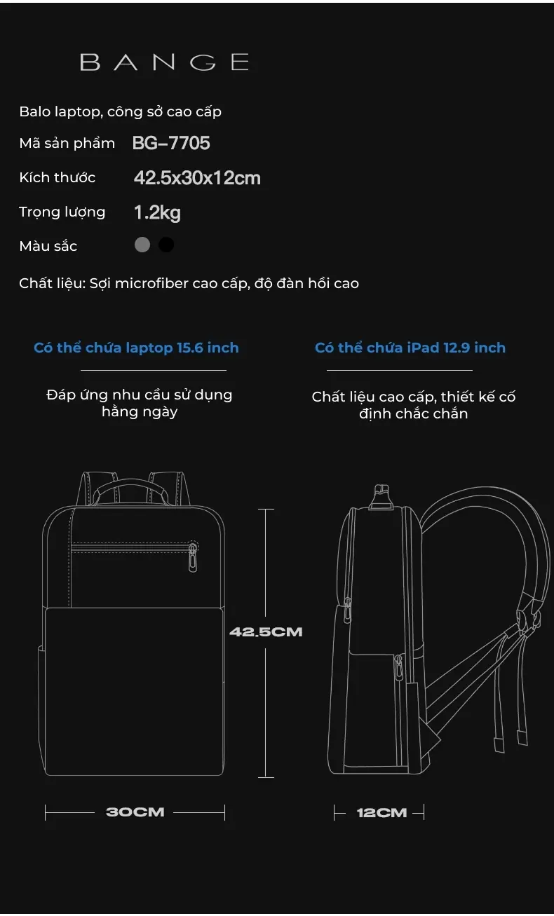 Bange 7705 có kích thước gọn gàng 42.5 x 30 x 12cm, Bange 7705 vẫn sở hữu không gian chứa đồ thông minh với ngăn chống sốc chuyên biệt, vừa vặn cho Laptop 15.6 inch, bảo vệ máy tính khỏi va đập. Màu sắc thời thượng: Có 2 tùy chọn màu sắc lịch lãm là Đen và Xanh đen, dễ dàng phối hợp với mọi trang phục.