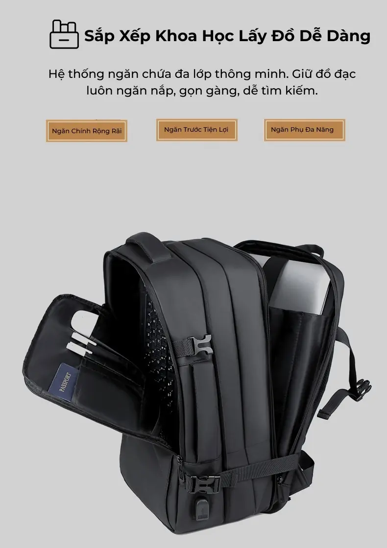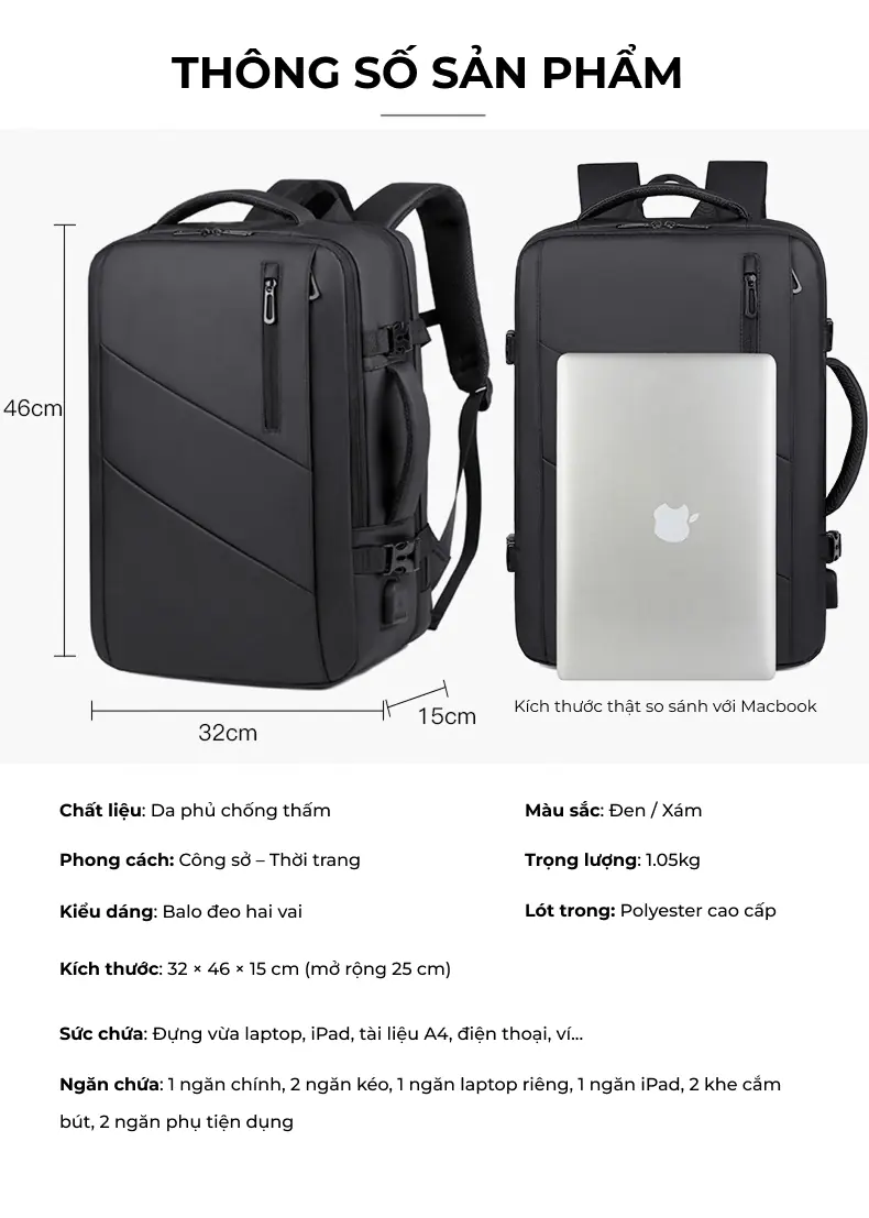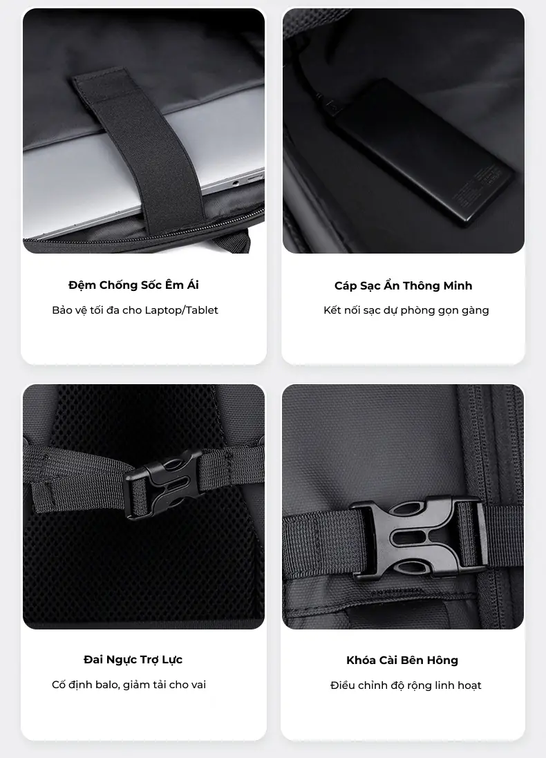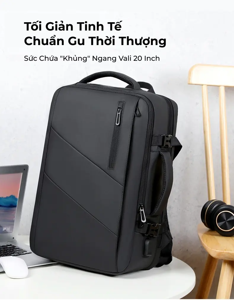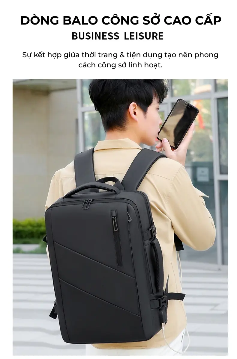 Thiết kế hiện đại, tối ưu cho công việc và di chuyển Mẫu balo laptop này sở hữu thiết kế vuông vức, nam tính với tông màu đen sang trọng, phù hợp hoàn hảo cho môi trường công sở hoặc các chuyến công tác.