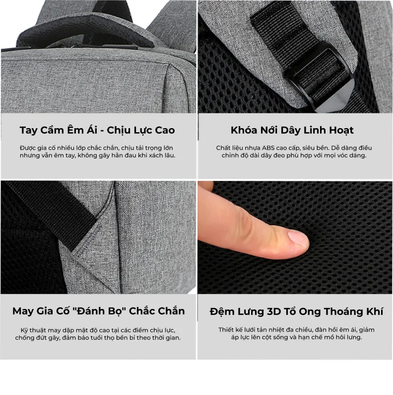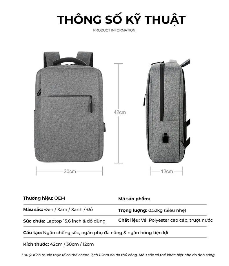 Thiết kế siêu nhẹ, tối giản và năng động Điểm nổi bật nhất của mẫu balo này là trọng lượng siêu nhẹ chỉ 0.5kg, mang lại cảm giác thoải mái tuyệt đối khi di chuyển cả ngày dài. Với kích thước gọn gàng (42cm x 30cm x 12cm), sản phẩm vẫn đảm bảo không gian chứa rộng rãi, vừa vặn cho laptop 15.6 inch cùng tài liệu và đồ dùng học tập. Đây là lựa chọn lý tưởng cho nhu cầu đi học, đi làm hàng ngày.